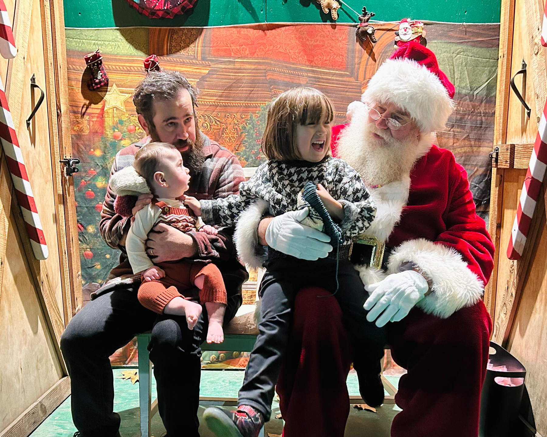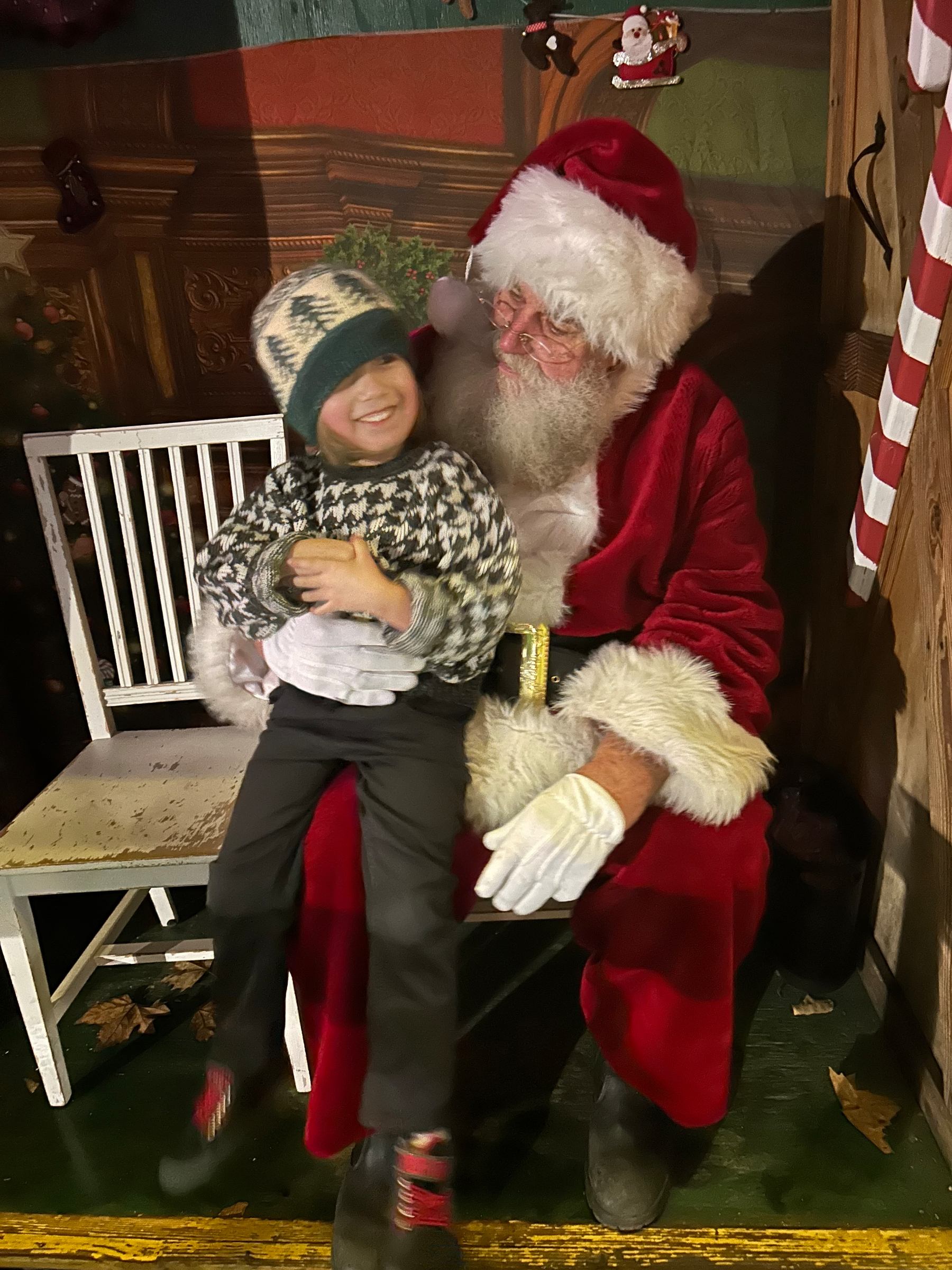 The main objective of the trip was to visit Santa, who was waiting out in the rain for kids that first night. Very devoted to the job. Dede asked for a camera; Artie didn’t really know what was going on but he was having a good time.