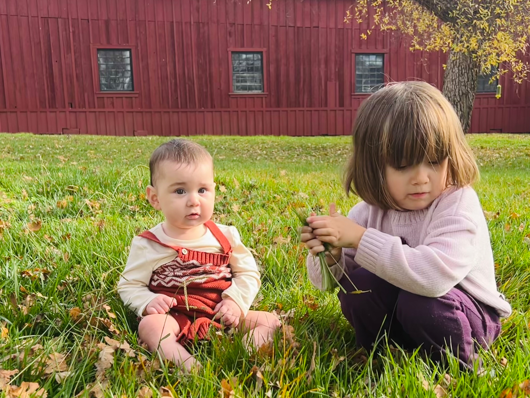 A baby sitting on a green field in front of a red barn.